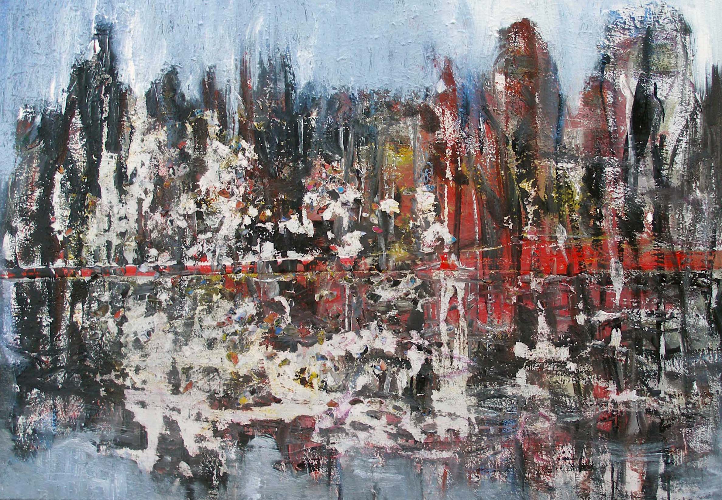 Dieses Bild ist teilweise durch Abreißen collagierter Papiere entstanden. Wandfarbe, Pigmente, Kleister auf Leinwand, 70 x 100 cm