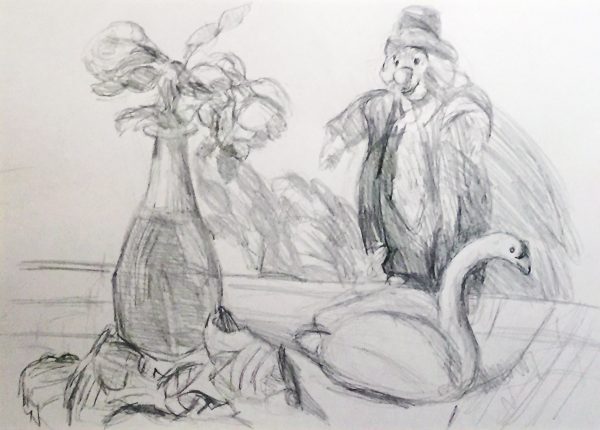 Tagtägliche Zeichnung: Der Schwan aus Filz schwimmt vorbei