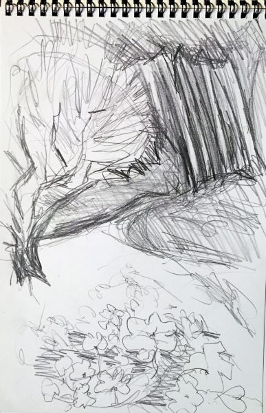 Wiese mit Frauenmantel und Ölbaum vor Kiefernwald