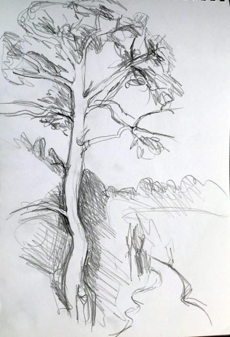 Kein Wind. Aber ich zeichne im Stehen, schnell und etwas unruhig, weil ich ein Auge auf den Hund haben muss. Daskommt den Zeichnungen zugute.