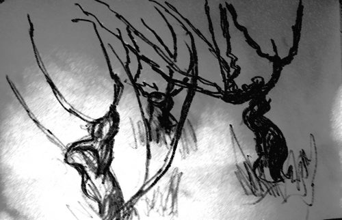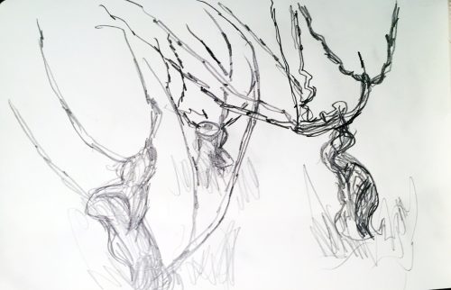 Heute war ich wieder auf dem Weinfeld bei den Wurzelmännchen, und obgleich es eisig war – die umliegenden Gebirge tragen nach den gestrigen Regenfällen eine dünne Schneeschicht – habe ich ihrem Tanz mit dem Bleistift nachgespürt.