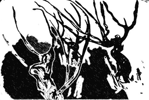 Zuhause habe ich die Skizze digital bearbeitet, ohne die Zeichnung zu verändern. Unter Ausnutzung der Licht-Schatten-Merkmale der Fotos entstanden – zusammen mit dem Original (1) – zwölf Varianten. Für zwölf Raunächte. (Anklicken = Vergrößern)