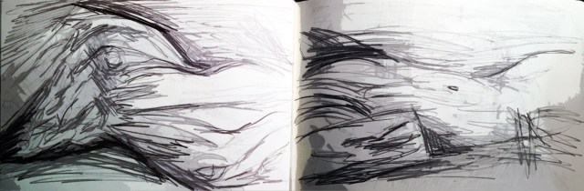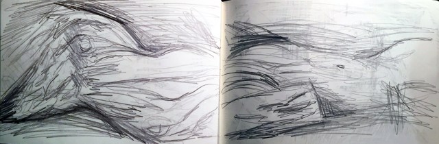 Heute versuchte ich den riesigen Stamm auf zwei fortlaufenden Blättern meines kleinen Skizzenbuchs ganz zu zeichnen.