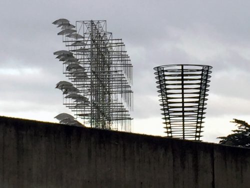Die schwebenden Boote sind nun das einzige, was man von der Kunstsammlung sehen kann, abgesehen von zwei hohen Skulpturen, die über die Umfassungsmauer ragen: Es sind die Schirme von Giorgos Zongolopoulos, über den ich schon mal berichtete, den anderen Künstler kenne ich nicht.