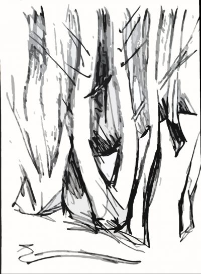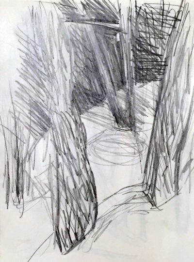 Meine anfängliche heutige Vornahme war, dem Wald seine geometrischen Formen abzulauschen. Schließlich aber ließ ich den weichen Stift einfach über das glatte Papier laufen, während ich mal stehenblieb, mal weiterging. So kamen acht Skizzen von Wegen und Baumstämmen zustande. Hier in der Reihenfolge des Entstehens (bei Interesse anklicken):