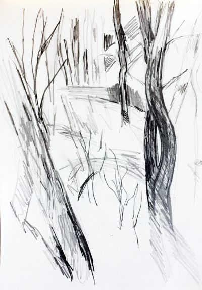 Gestern ließ ich die Stämme der Bäume an mir vorbeilaufen, während ich ging. Hier noch einmal drei gestrige Skizzen, die ich neu fotografiert habe – plus zwei, die ich gestern vergessen hatte.
