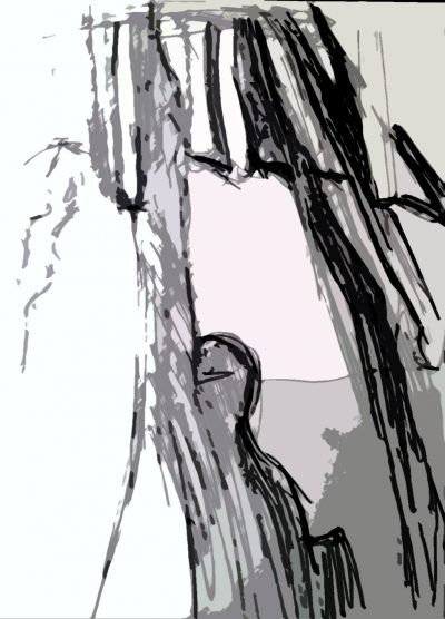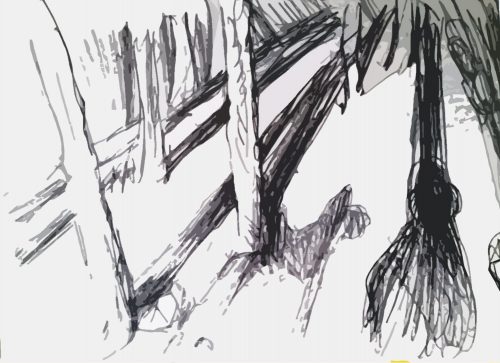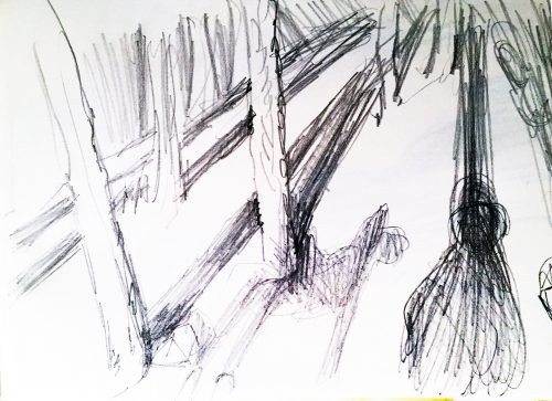 Später dann geriet ich in ein hochstämmiges Waldstück, in dem die Pinien, ich selbst und gelegentlich auch mein Hund lange Schatten warfen. Zunächst machte ich stehend zwei schnelle Skizzen, dann, wegen der Rückenschmerzen, eine im Sitzen, immer angelehnt an einen Baumstamm, dessen Schatten sich mit meinem verband. Erst bei der dritten Skizze wurde mir bewusst, wie die Schatten über den leicht welligen Boden laufen und sich dabei verformen. Ich denke, es lohnt sich, dranzubleiben. Hier seht ihr die drei Skizzen jeweils mit einer Bearbeitung.