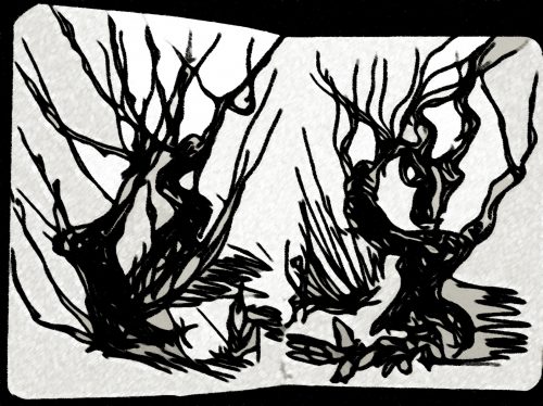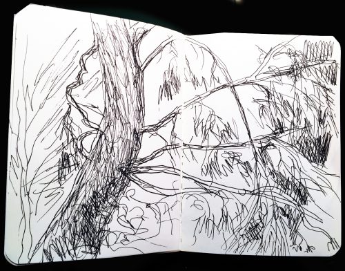 Vorher war ich wie immer in meinem Wald, bewaffnet mit einem neuen kleinen Skizzenbuch und einem neuen Tintenkuli. Ein bisschen kalt kamen mir die Skizzen vor, es fehlten mir die Wärme des Graphits und die wechselnde Intensität des Grau, je nach Druck meiner Finger. Aber schon bei der zweiten Skizze – den Wurzelmännchen – begann ich mich sicherer zu fühlen. Für Konturzeichnungen ist der Stift gar nicht so schlecht, dachte ich. Außerdem lassen sich die Zeichnungen besser fotografieren, da die Tinte nicht glänzt.