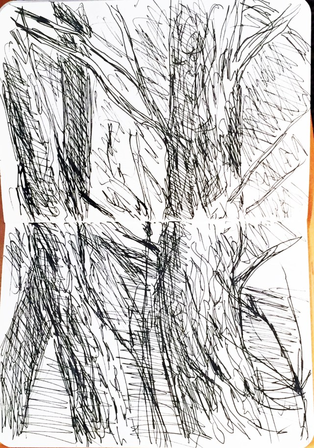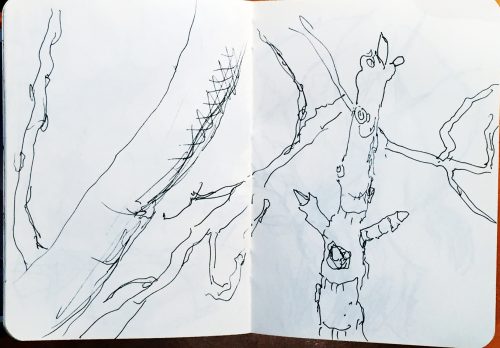 Heute habe ich den Tintenstift an mehreren Motiven ausprobiert. Ich benutzte wieder das kleine Skizzenbuch doppelseitig. Ich begann mit einem Feigenbaum, der erste Knospen treibt. Es folgten ein paar Wurzelmännchen.
