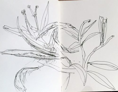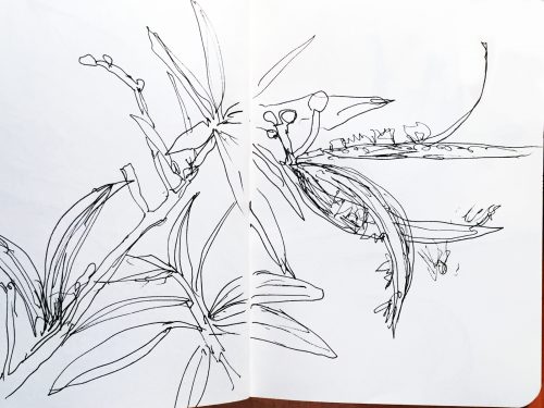 Der Oleander hatte genau die Eigenschaften, die mir beim Zeichnen mit Tintenstift gefallen. Also machte ich gleich zwei Skizzen: klares Lineament, interessante Umrisse, Bewegung.