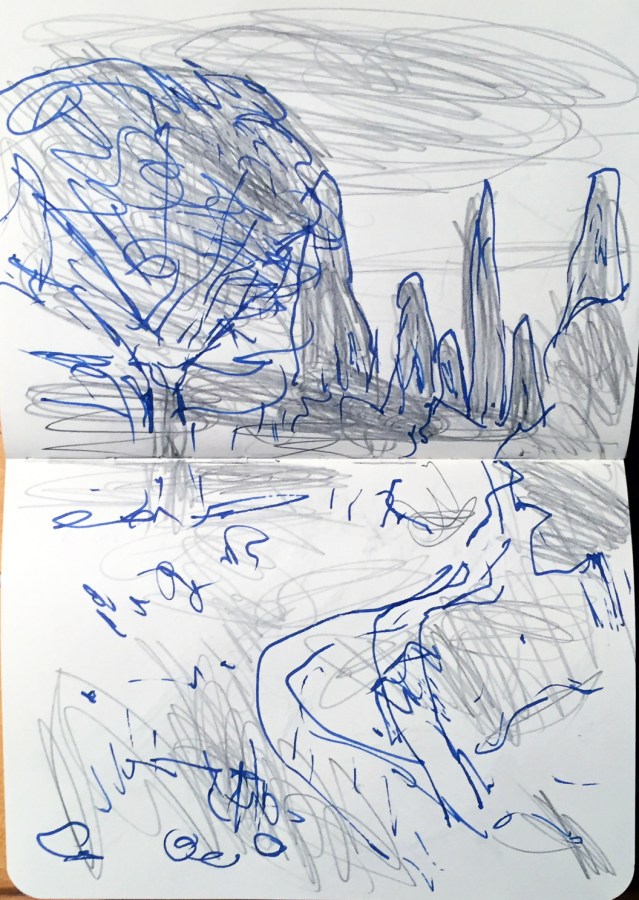Skizzieren mit blauer Tinte und Bleistift, sowie Bearbeitungen