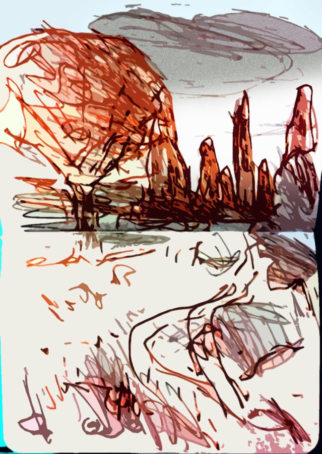 Skizzieren mit blauer Tinte und Bleistift, sowie Bearbeitungen