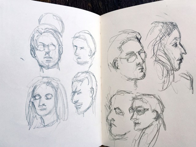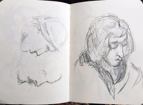 Heute hatte ich in der Metro Zeichenzeug dabei, weil ich im Akropolis-Museum zeichnen wollte. Um mich nicht zu langweilen, begann ich, die Leute, die ziemlich verfroren im Wagen saßen oder standen, heimlich mit Bleistift in mein kleines Zeichenbuch zu skizzieren.
