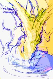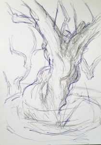Ferner noch einmal die Ölbaum-Zeichnungen, diesmal bei Lampenlicht fotografiert und auf dieselbe Weise bearbeitet. Die Farben der Fotos habe ich auch diesmal nicht verändert, sondern nur verstärkt.
