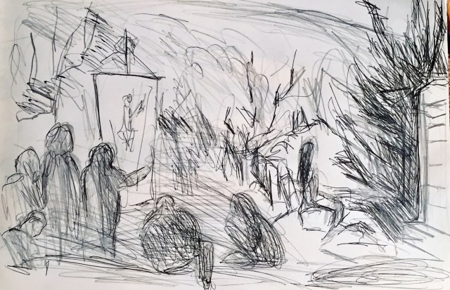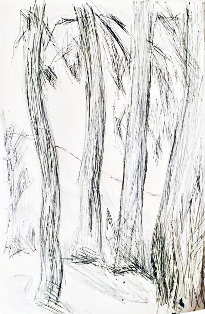 Ich versuchte auch ein wenig zu skizzieren, zunächst die hochragenden Pinien – einmal mit Bleistift, einmal mit Kuli und Bleistift gezeichnet. …