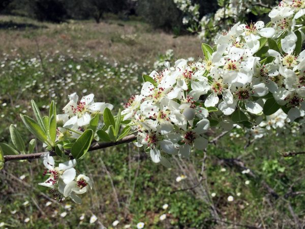 Hm. Du hast ja den ganzen Baum gesehen, der eine breit ausladende Kugel bildet , die eigentlich nicht birnenartig ist. Außerdem riechen die Blüten nicht gut, daher kam ich auf Schlehe, die ich allerdings hautsächlich als Strauch in unseren norddeutschen Knicks kenne. Es gibt sie freilich auch hier.