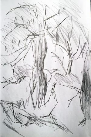 Der Platz, an dem ich heute zeichnete, ist ideal zum Ausruhen, denn man hat Baumstämme zum Sitzen und einen weiten Blick. Thematisch aber ist er eher problematisch, denn von dem ursprünglichen Wald ist nach einem Brand nicht viel übrig. Gleichmäßiger Bewuchs bedeckt den Boden, dazwischen wachsen kleine Zypressen, nur wenige große Pinien blieben erhalten.