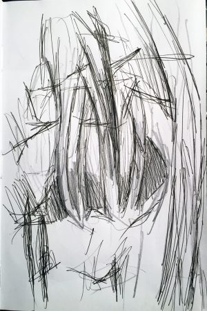 Als erstes machte ich eine realistische Skizze. Dann suchte ich nach Kürzeln und Strukturen, ohne ins Detail zu gehen. Zum Zeichnen benutzte ich einen neuen Block      (14 x 21 cm), Bleistift und fineliner.