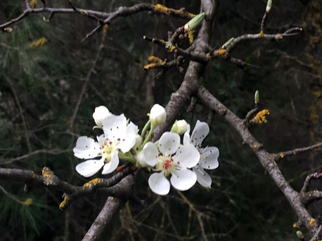 Nicht eine, nicht zwei – viele Blüten hatte der alte von gelben Flechten überzogene Mandelbaum an diesem lichtlosen Ort hervorgetrieben.