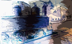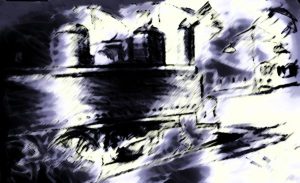 Eine Skizze schaffte ich und fotografierte sie gleich vor Ort mit verschiedenen Verschattungen, durch die die einfache Zeichnung erheblich an Dramatik gewinnt. Die Lok, die in Wirklichkeit ja nur herumsteht – schließlich ist es ein Museum -, scheint in den Bahnhof einzufahren. Erinnerungen werden wach an Zeiten, als es noch dampfende, spuckende lärmende Loks gab.