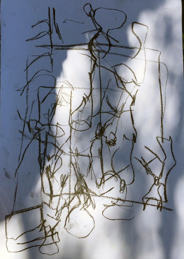 … WAREN SELBST UND WELT IHM EINS. Blindzeichnung in Kohle auf Zeichenkarton, Licht-Schatten-Fotografie, unbearbeitet. (c) gerda kazakou 04/2019