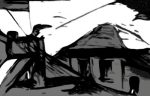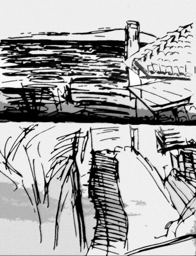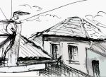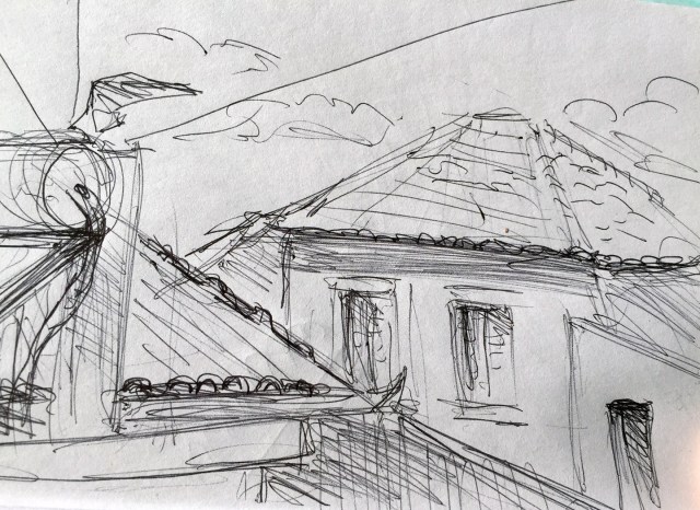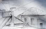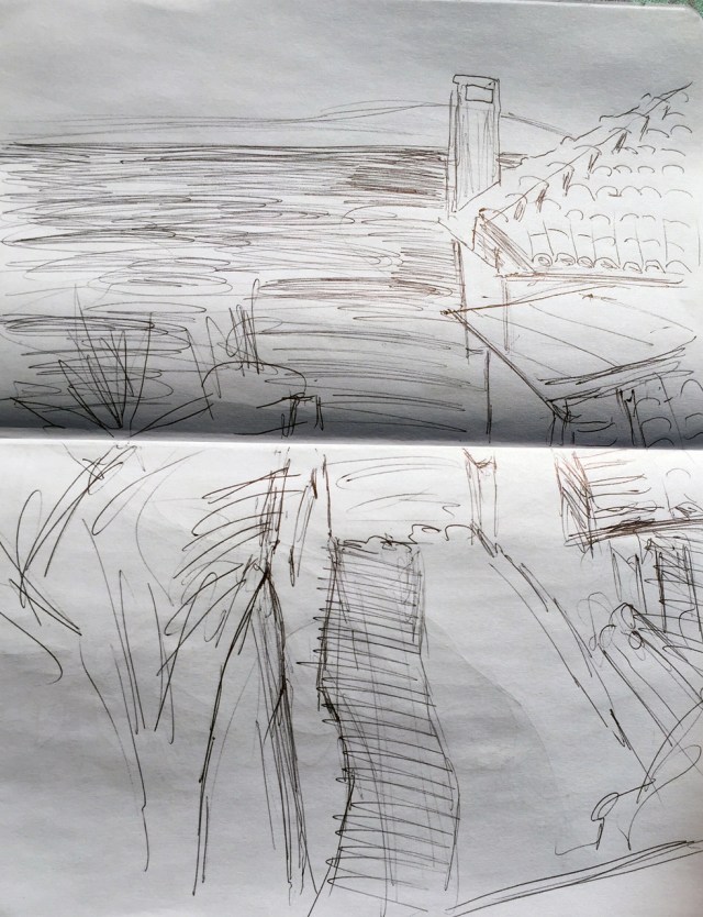 Nicht nur am Bahnhof, auch in der Taverne habe ich heute ein wenig gezeichnet, hab mich an den Dächern versucht. In der Tiefe läuft zwischen Haus und Mauer ein asphaltierter Pfad, zur Hälfte von der Mauer verschattet, hinunter zum Meer. Das war dunkel mit hellen Schaumkronen. Am Horizont der letzte „Finger“ der Peloponnes.