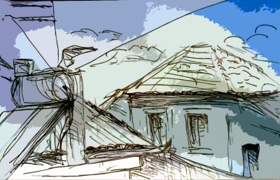 ← Skizzieren im Tavernenhof (vier Skizzen, fotografiert und bearbeitet)