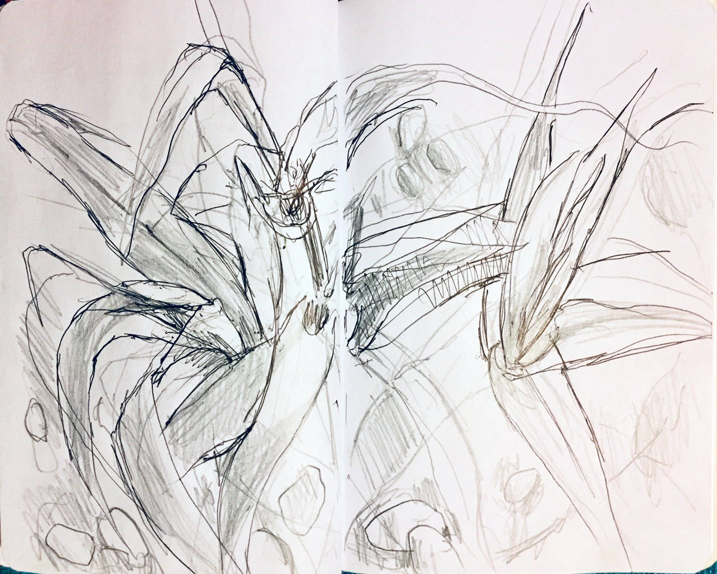 “ Schilfsprösslinge am Strand“, Beistift und Kuli, Doppelseite Skizzenbuch (c) gerda kazakou, 03-04-2019