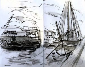 Gestern aßen wir wieder am Segelhafen, allerdings unter einem Dach, denn der Sturm brachte kurze Regenschauer mit. Dennoch wollte ich ein wenig skizzieren und setzte mich draußen auf eine Bank am Hafen.