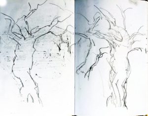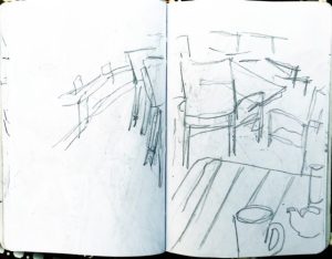 Hier noch zwei sehr schnelle Skizzen, die unterwegs entstanden. Die erste Skizze zeigt den Tanz von Olivenbäumen, die zweite meinen Tisch bei Babis samt Teebecher und Kännchen und im Hintergrund leere Stühle und Tische und ein Holzzaun zum Meer. Wieder habe ich mit unterschiedlicher Verschattung fotografiert, um die Fotos anschließend zu bearbeiten.