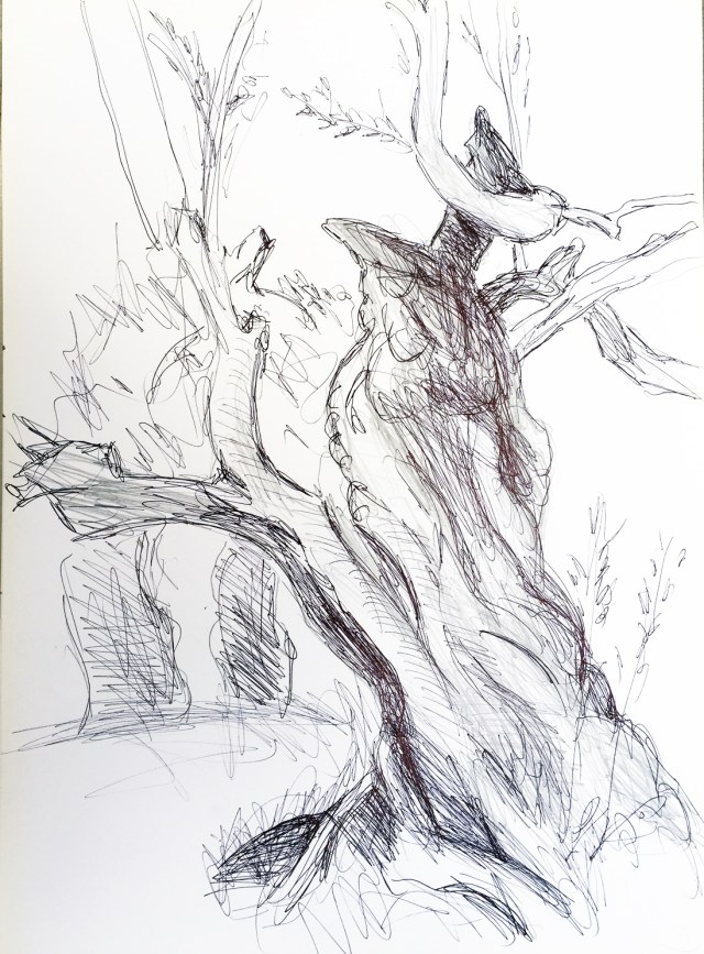 Am Abend – es war schon recht kalt, aber noch hell genug – habe ich meinen neunten Olivenbaum gezeichnet. Fotografiert habe ich die Zeichnung im Garten. Viel Licht gab es da nicht mehr, also habe ich das Foto ein wenig künstlich aufgehellt.