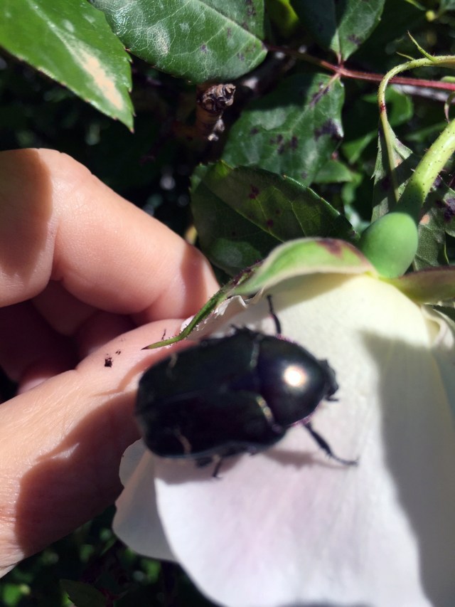 Das ist der Zwiespalt, in dem man sich befindet, wenn man einerseits für den Erhalt der Insekten sensibilisiert ist und andererseits seine Pflanzen schützen möchte. Wenn die Zahl der Rosen – wie bei mir – überschaubar ist, lohnt sich das Wegtragen… Anderenfalls? Ich war zum Glück noch nicht in der Situation: Bei Blattläusen setze ich Ameisen aus. Aber wie dieses dicke Vieh muss man wohl selbst Hand anlegen.