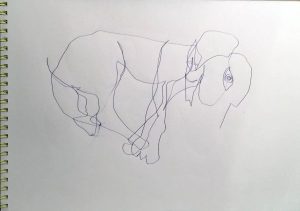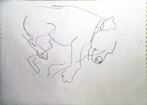 Im Halbdunkel zeichne ich Tito, der es sich auf dem Sofa bequem gemacht hat. Ich zeichne blind, also ohne auf meine Hand und das Blatt zu schauen. Und bearbeite die vier entstandenen Zeichnungen. Wenn du sie anklickst, siehst du mehr.