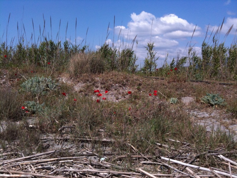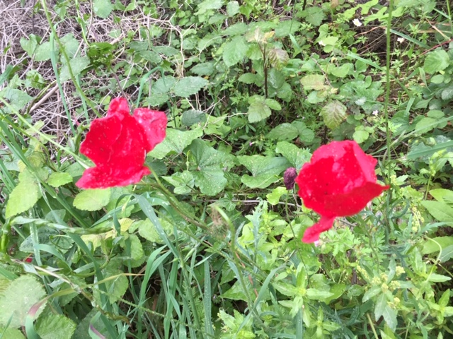 In diesem Jahr habe ich bisher nur ein paar Blutstropfen des Mohns gesehen, aber in anderen Jahren um diese Zeit rot gesprenkelte Felder. Die Fotos sind vom 13.4.2016, aufgenommen am Weststrand. Außer dem Mohn siehst du eine Fläche mit violett blühenden Blumen.