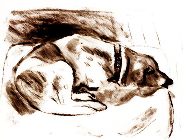 Das Skizzieren mit Kohle geht mir viel leichter, flüssiger von der Hand, als mit dem Kuli. Ich kann mit der Spitze und mit der Breitseite zeichnen, kann wischen und löschen und neu zeichnen. So entstand auch die Zeichnung von Tito über einer ersten Skizze, die ich abbrechen musste, weil Tito beschloss, seinen Platz zu wechseln. Ich zeige mal, wie der erste Anlauf aussah und wie die endgültige Zeichnung, die ich darüberlegte, nun ausschaut. Hinzu füge ich eine bearbeitete Fassung mit den tatsächlichen Farben des Hundes.