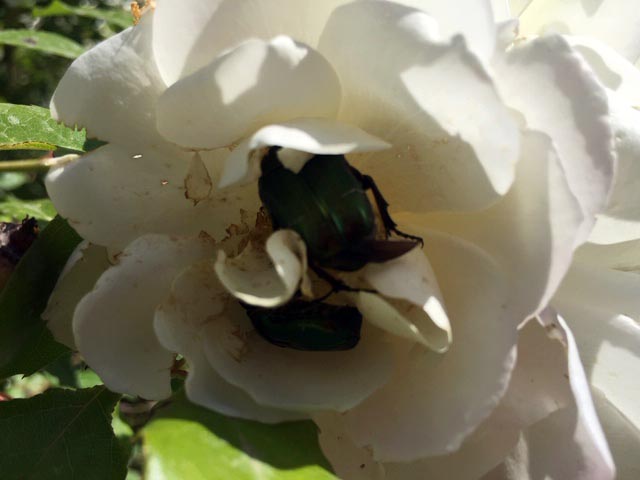 Ja, ja, es sind die Rosenkäfer. Viele habe ich abgesammelt, und so blüht der Busch nach Herzenslust und verbreitet ungestört seinen verlockenden Duft. Doch plötzlich waren sie wieder da – nicht einer, nicht zwei, sondern viele -, und machten sich über die Blüten her. Macht nix, denke ich, die Hauptblüte ist sowieso vorbei. Ich werde die vertrockneten Blüten abschneiden. Das tue ich sowieso immer, um ein zweites Blühen hervorzulocken.