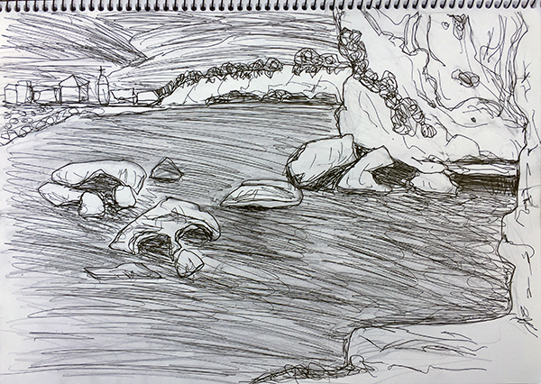 Die bewegliche Linie des Kulis, die den Bewegungen der Küste, des Wassers, der Bäume spielerisch folgt, und der farbliche Kontrast von Bleistift und Kuli zeigen sich in der digitalen Bearbeitung noch deutlicher.