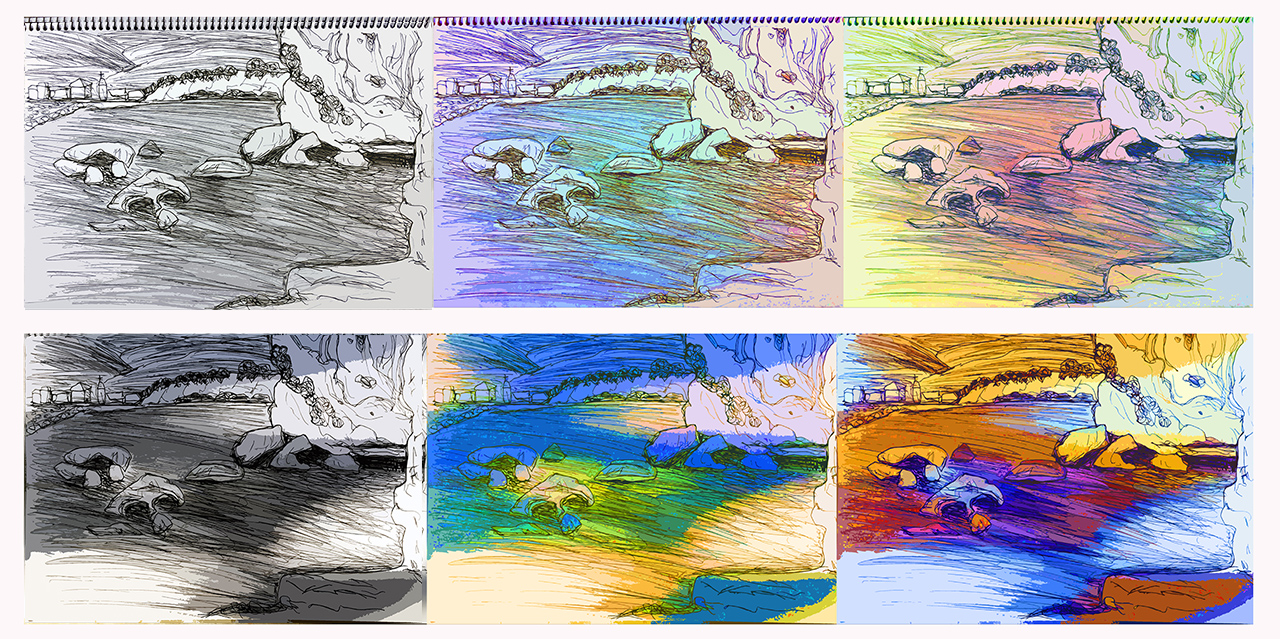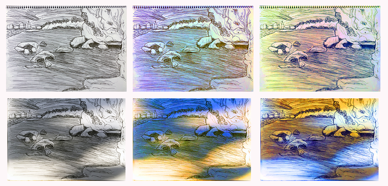 Die obere Bildleiste zeigt die im Schatten fotografierte, die untere Bildleiste die im Licht-Schatten fotografierte Skizze, dazu je zwei Bearbeitungen. Die Bearbeitungen sind jeweils auf dieselbe Weise entstanden: Farbverstärkung (1. Variante), dann Farbverschiebungnach links ins Gegenteil (2. Variante).