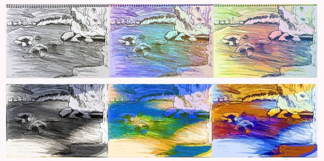 Danke, Babsi, für die Nachfrage. Nein, ich habe keine Filter drübergelegt, sondern nur die auf dem Foto der SW-Zeichnung bereits vorhandenen Farben verstärkt. Bei den Licht-Schatten-Fotos ergeben sich sehr starke Effekte, weil die verschatteten und die beleuchteten Partien sich unterschiedlich farblich darstellen. Ohne Farbverschiebung (die jeweils erste Variante) wirkt das Schattige Blau, das Licht weiß, zu den Rändern hin wird es dann Gelb, das sich mit dem Blau zu Grün vermischt. Das sind so die Haupt-Eindrücke. Beim Farbverschieben verschieben sich diese Farben alle gleichzeitig, bis ich zur Variante 2 komme, wo die Farben sozusagen auf den Kopf gestellt (in ihr Gegenteil verkehrt) sind. Licht- und Schatten-Partien haben ihre Rollen gewechselt.