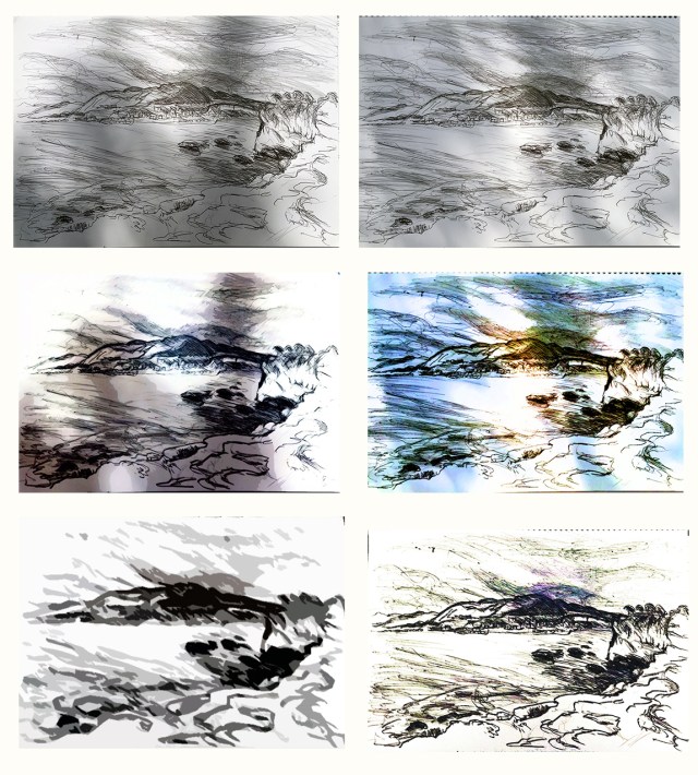 Die Fotografie der Skizze unter verschiedenen Lichtbedingungen (Foto 1 und 2) und deren digitale Bearbeitung (Fotos 3-6) betonen das Wechsellicht, das heute in der Natur herrschte.