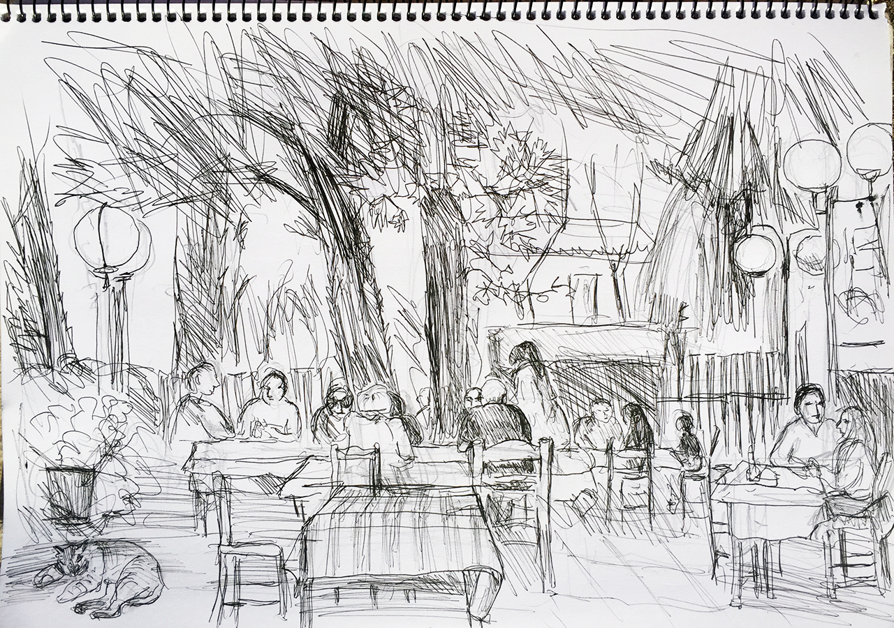 Vor und nach dem immer leckeren Essen in der Taverne „Argo“ (ich aß Bamies = Okragemüse) skizzierte ich andere Gäste, den Platz mit seinen Tischen, Stühlen, Lampen und schattenden Bäumen und eine Katze, die ihre Siesta hielt.