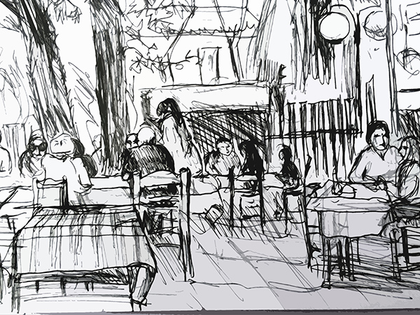 In der Taverne „Argo“ (Kuli-Bleistift-Zeichnung, digitale Bearbeitungen als Dia-Show)