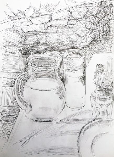 ← In der Taverne: Wasserkaraffe etc (Bleistift-Kuli-Zeichnung)