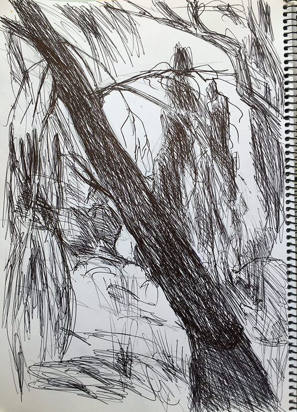 Im Syngrou-Wald setzte ich mich, erschöpft vom Tag und der Juni-Hitze, auf einen Stein, und zeichnete einen sehr schräg wachsenden dicken Pinienstamm sowie das, was um diese Diagonale herum und dahinter sichtbar wurde.