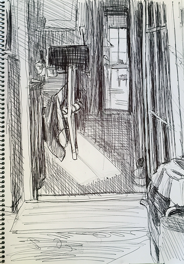 Zu Hause setzte ich mich auf den Balkon und blickte von dort durch die Küche bis ins Wohnzimmer am anderen Ende des Ganges, das seinerseits durch ein Fenster erhellt wurde. Das Licht änderte sich während des Zeichnens, am längsten hielt sich das helle Viereck auf dem Küchenboden, das ich gerne aufgriff, da es ein Gegengewicht zu den senkrechten und waagrechten Linien bildete.