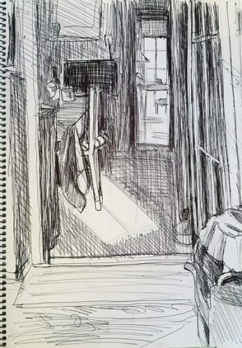 ← Waldstück und Durchblick durch die Küche (zwei Zeichnungen. Bemerkungen zu Motivwahl und Bildaufbau)