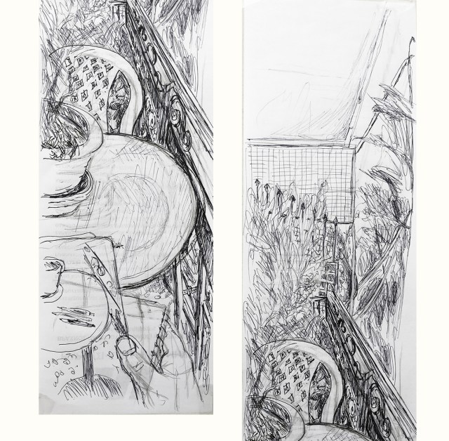 In meinen Skizzen aber wird der Blick absichtlich in die Tiefe geführt, und das gelingt auch, obgleich die Dinge am Rand abgeschnitten sind.