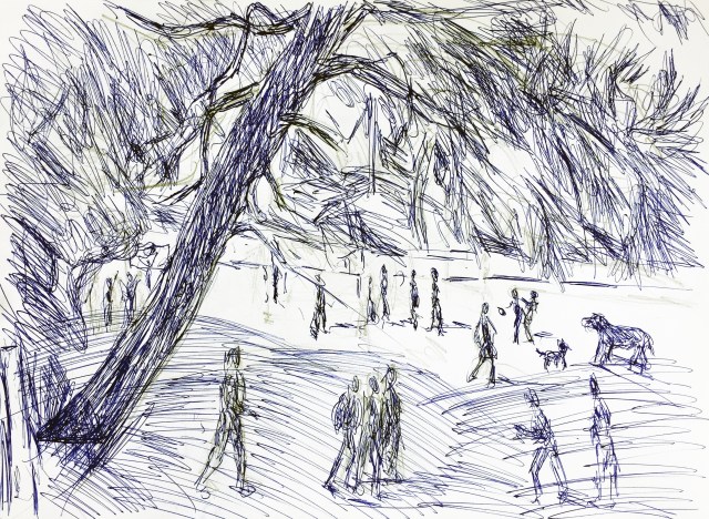 Seit ich ständig meinen Skizzenblock mit mir herumtrage und zeichne, was ich vor mir sehe, beginnt sich ein neuer Schwerpunkt zu entwickeln: Menschen und ihre Beziehung zur Umwelt. Das fiel mir heute auf, als ich bei meinem spätnachmittaglichen Hundespaziergang zielstrebig das Sportfeld im Syngrouwald ansteuerte, in der Erwartung, dort nicht nur Bäume, sondern auch Menschen anzutreffen.