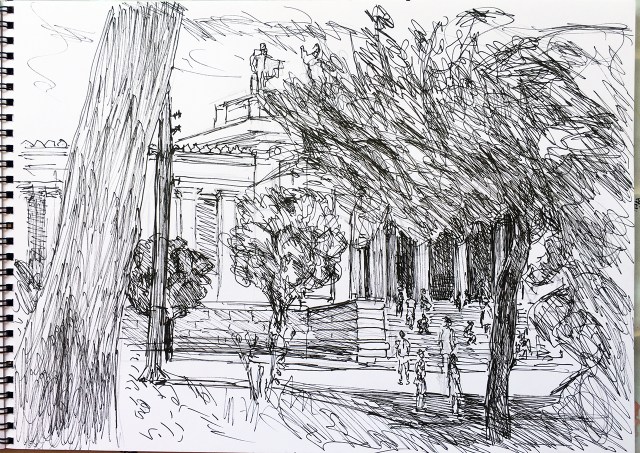 Das Museum war noch geschlossen (Dienstags macht es erst um halb eins auf). Mit mir warteten etliche Menschen darauf, dass sich die Türen öffneten. Ich setzte mich abseits in den Schatten eines Baumes auf eine Bank – genau wie gestern ragte der Stamm von links kommend schräg ins Bild hinein – und zeichnete ziemlich akribisch die klassizistische Architektur des schönen Gebäudes, dazu auch die Kultur-PilgerInnen auf der Treppe und was sonst noch so vor meinen Augen lag. Als ich fast fertig war, kam eine chinesische Dame zu meinem Versteck. Sie habe auch Kunst studiert. Aus Shanghai sei sie. Ich bat sie, mir das Foto, das sie von mir und der Zeichnung machte, gelegentlich zu schicken. Post aus China – das wäre doch mal was!