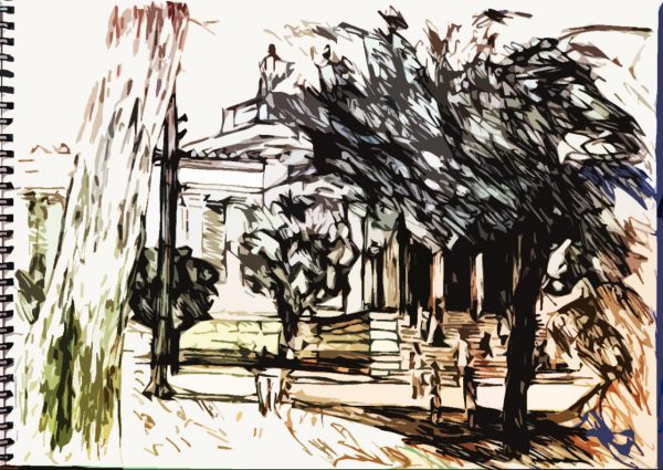 Deine Skizze vom klassizistischen Gebäudekomplex ist Dir so gut gelungen. Deine Hand hat die Linien wohl genau abgemessen und dabei keine Sekunde gezögert, Sie wußte genau, was zu tun war und Dein Versteck war gut gewählt! Irgendwann wirst Du Post aus China bekommen und wir werden Dich zeichnend sitzen sehen.